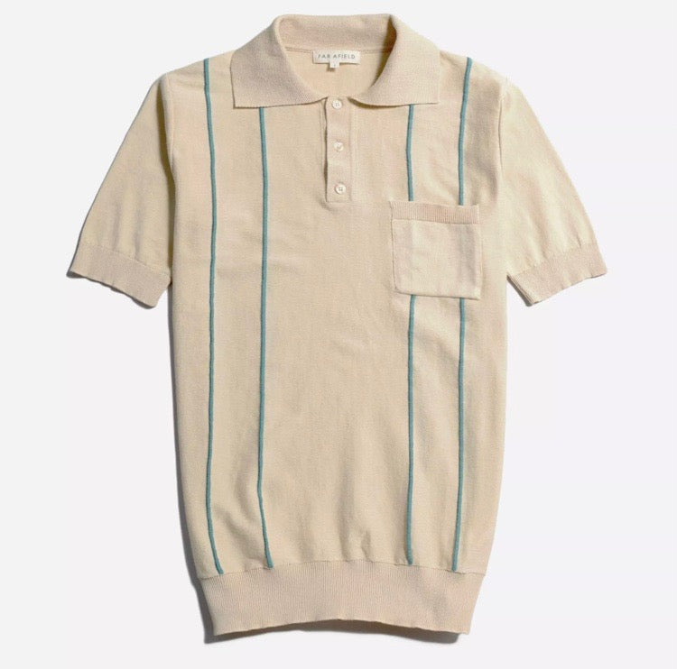An Anglo/Italian-inspired short sleeve polo in a quadruple stripe design. Featuring a large classic collar, ribbed cuffs and hem, square chest pocket, and three button placket.