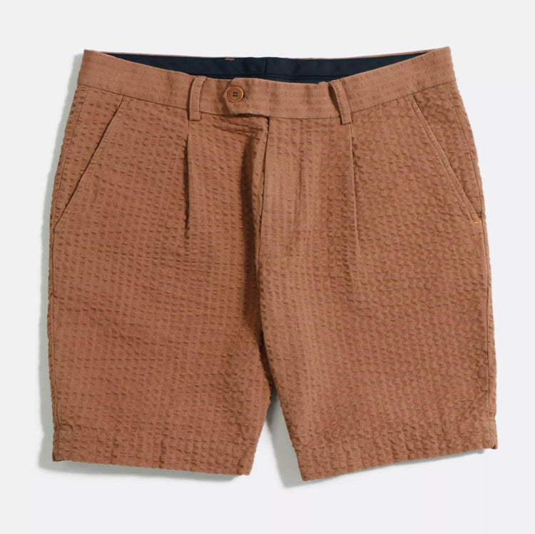 A pair of brown pleat shorts with small front pleats and side seam pockets, featuring a zip fly opening and corozo buttons.
